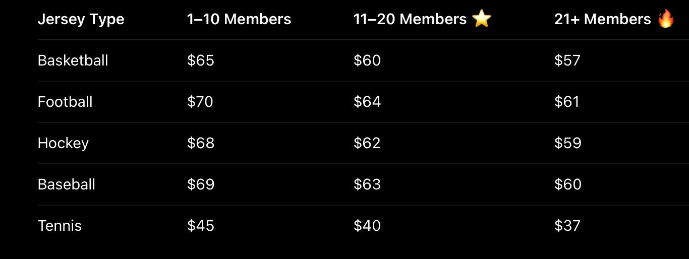 Our World Class designer takes care of the entire design process based off of the information your group provides! We design the following types of jerseys!